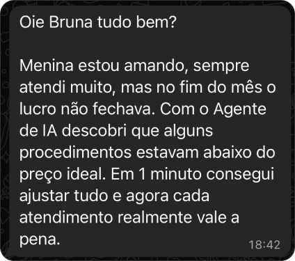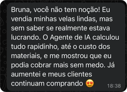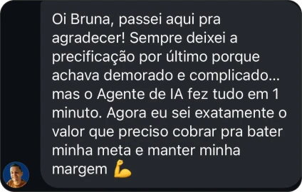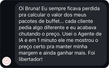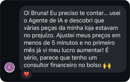 O nosso Agente de IA de Precificação calcula e entrega um relatório claro com sua margem de lucro real, a margem ideal e o preço exato para vendas mais e lucrar de verdade.